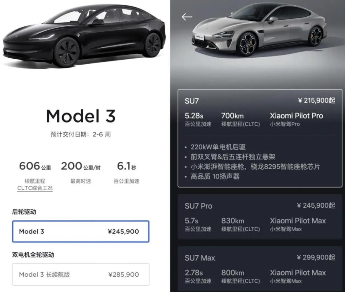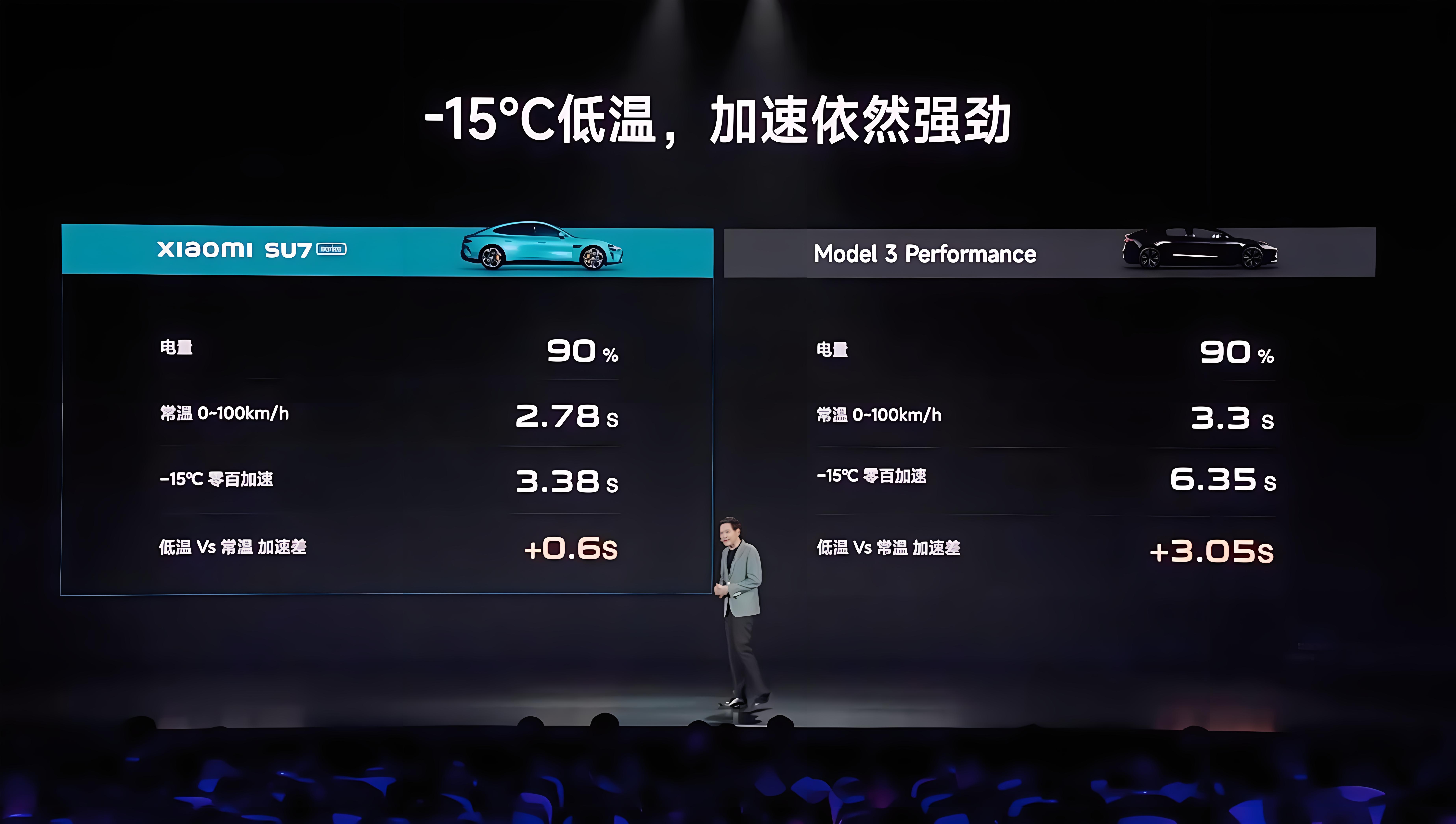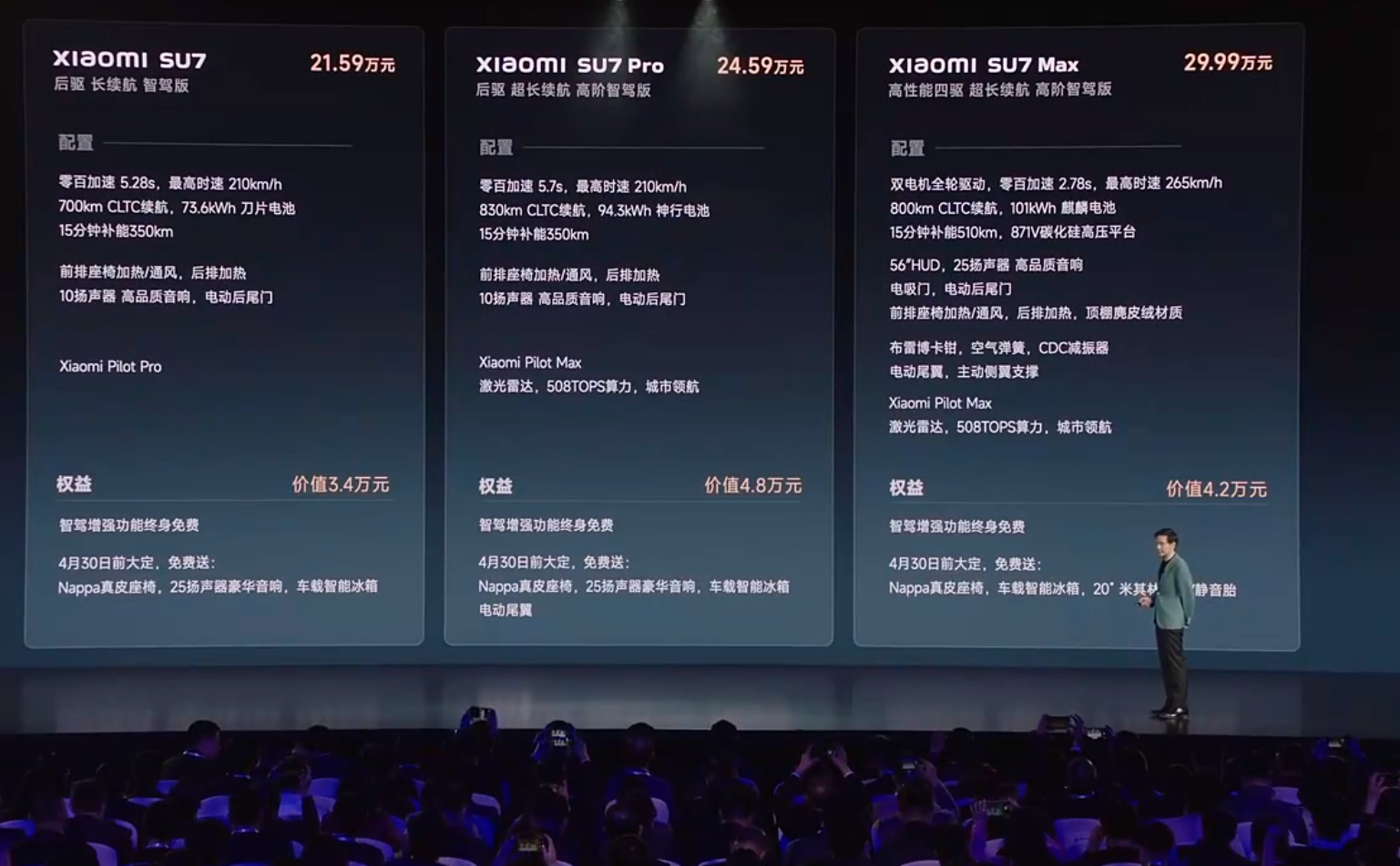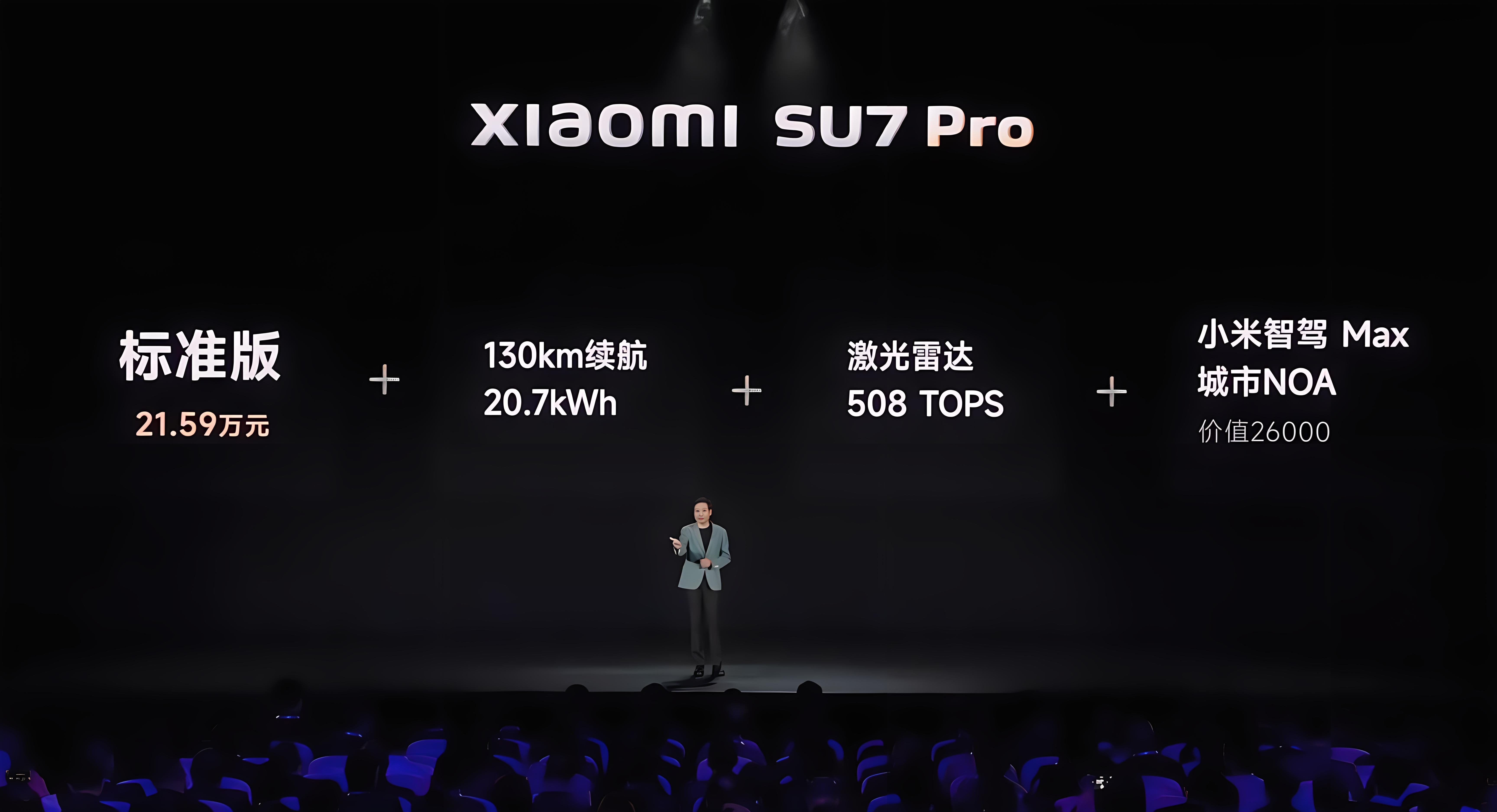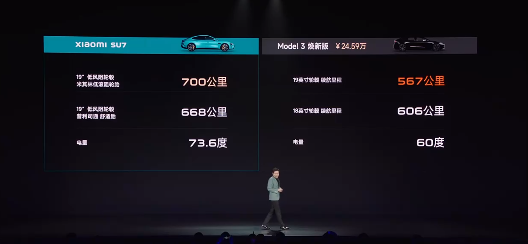 在发布会上,雷军频繁提及“对标”一词,明确表示XIAOMI SU7将特斯拉Model 3作为主要的竞争对手。XIAOMI SU7的标准版,定价为21.59万元,相较于Model 3的焕新版便宜了3万元。在空间、性能、续航能力和舒适性等方面,SU7标准版展现出了明显的优势。雷军也坦诚地指出,尽管SU7在电耗和智能驾驶算力方面与特斯拉还存在一定差距,但小米将持续努力,不断缩小这一差距。