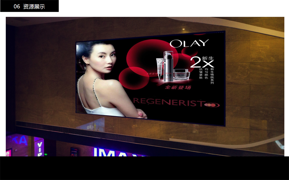 影院广告主要分为贴片广告和阵地广告。贴片广告是以电影银幕作为载体,是在电影正片开始之前的播放的视频广告。影院阵地广告是以影院空间为载体的广告形式,比较常见的有展架、立牌、灯箱、LED屏、地贴、海报栏、内墙外墙喷绘等。